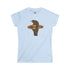 Crafted from 100% cotton, this Women's Softstyle Tee combines comfort and style. It features art by Swiss surfer, artist, and environmentalist Fabian Lavater of a California Grizzly Bear carrying the Ventana Treefish surfboard