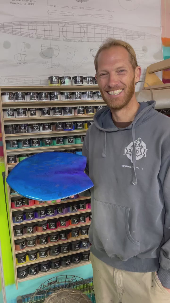 This fish-shaped, performance handplane made features ghost anchovies and jellies made from pigments by Black Diamond Pigments. They appear in the blue when you look at the handplane from different angles. The material is Owens Corning packing material that was headed to the landfill. It's incredibly lightweight (226 grams!), and our fiber glassing ensures that it's strong and ready for the waves.