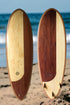 It has a thruster fin setup with fins of balsa which were offcuts from a model boat project. The fin stripes are made from mahogany plywood taken from the transom of an old Zodiac inflatable boat used for SCUBA diving. The nose is punctuated with a dot of abalone inlay and, like all Ventana boards, this one is glassed with Entropy Bio Resin and uses two sheets of 4-ounce fiberglass cloth on the top and one on the bottom.