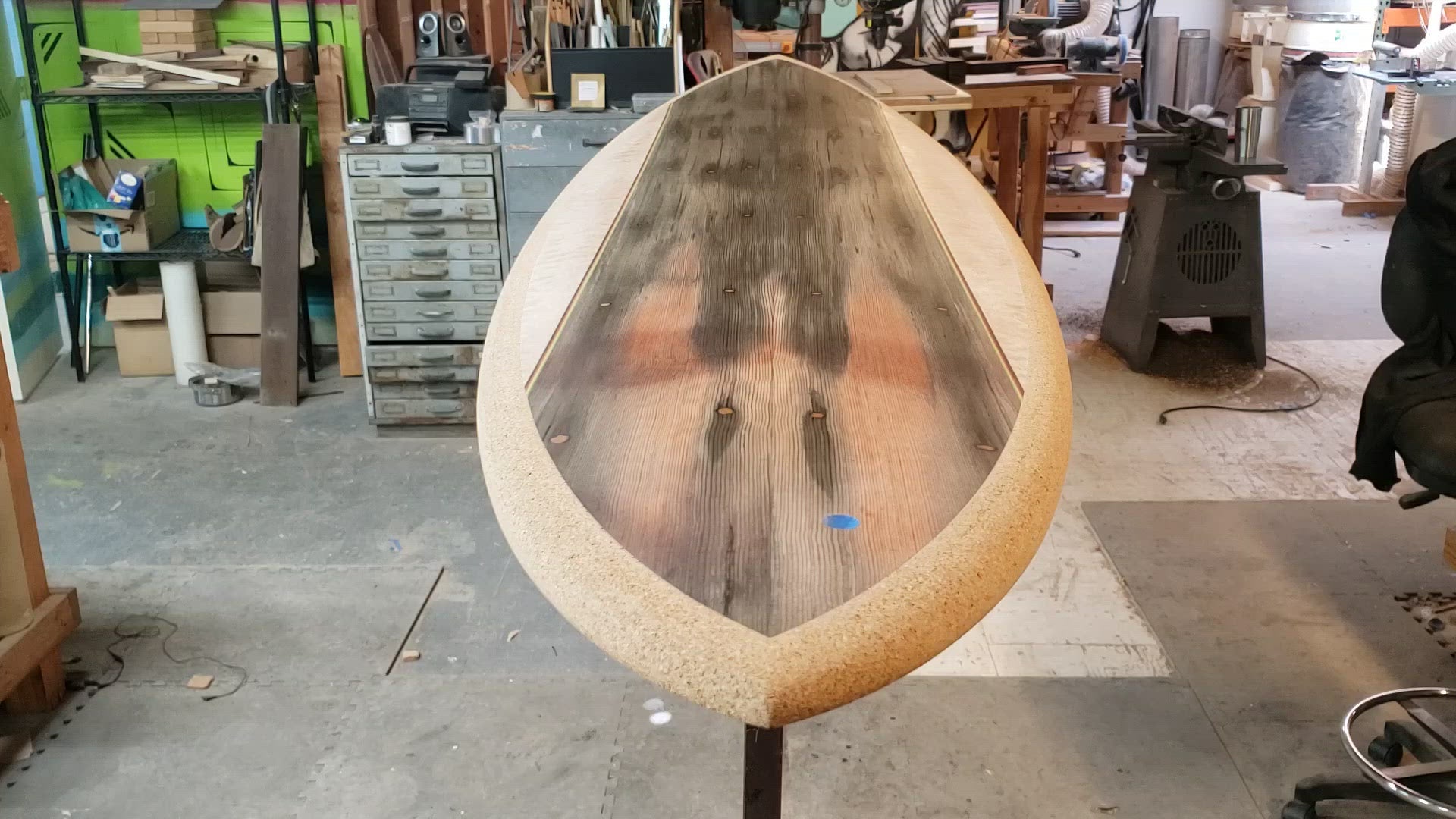The rails are made of cork which is more resistant to dings. There are two sheets of Aerialite 4 ounce fiberglass on top and one on bottom. The epoxy is Entropy Resins bio-based epoxy which is up to 40% tree sap and is very strong and light. Sanded with Uneeda, Inc. sandpaper.