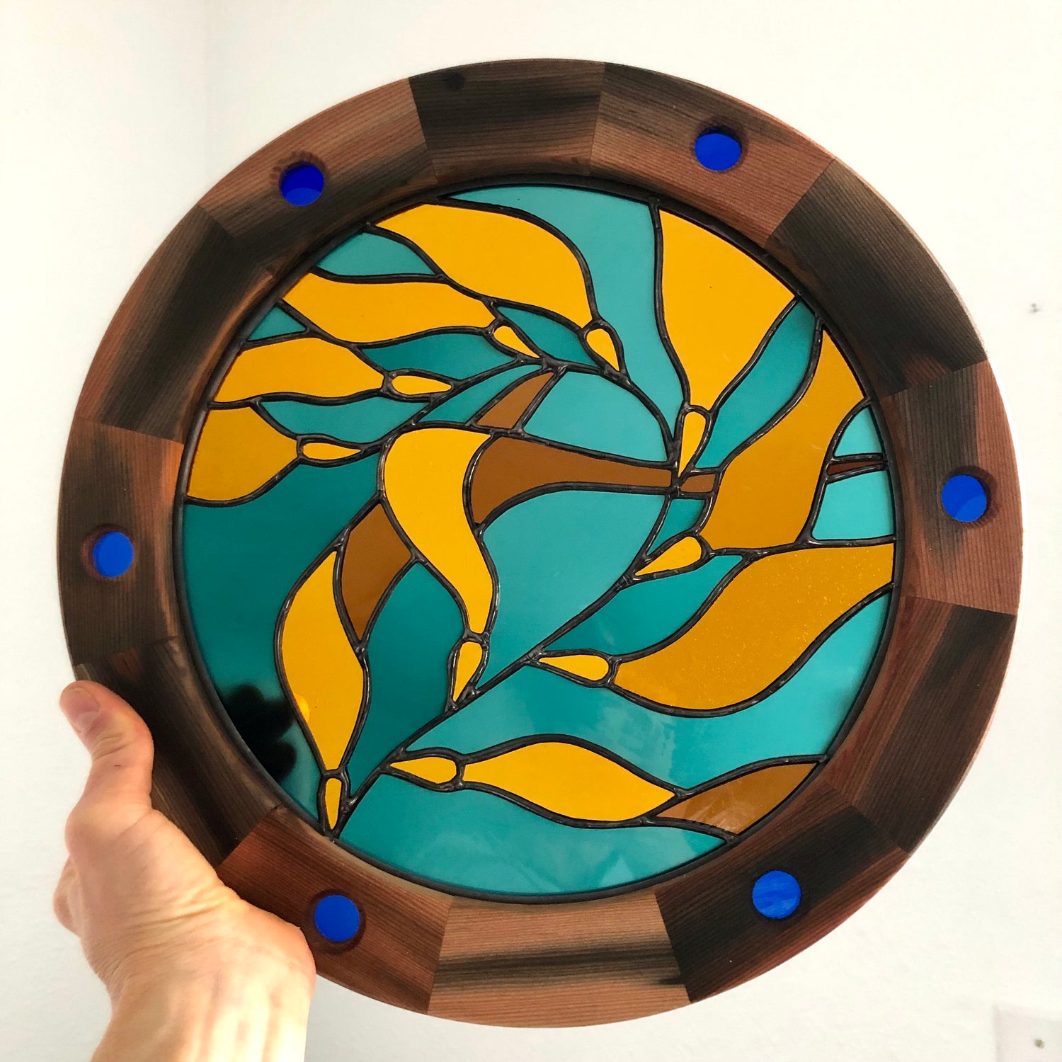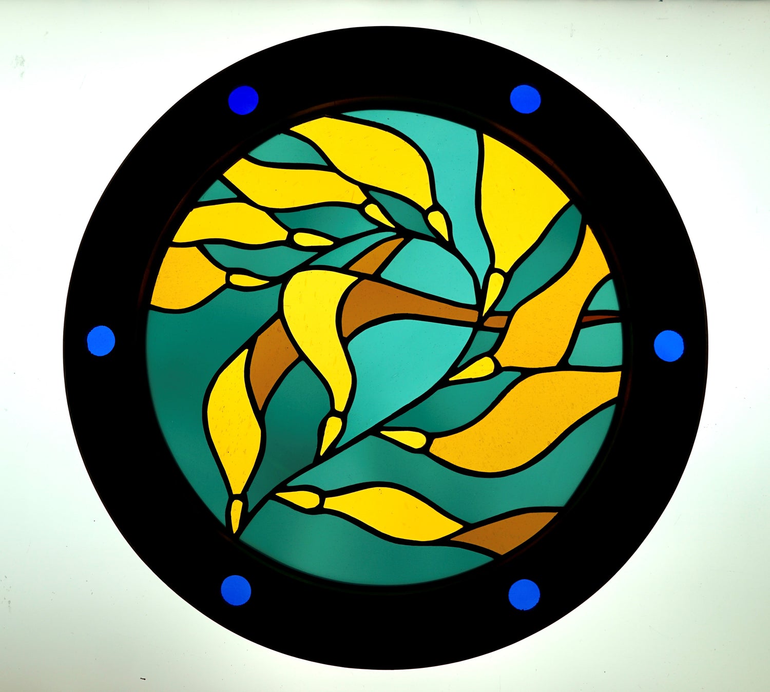 A collaborative work of art between Ventana and Haven that is the sister piece to Western Flyer. This piece includes a frame built by Ventana from original Western Flyer Douglas fir hull wood with a stained glass panel by Haven. Kelp is a favorite for Haven to create. Anyone who loves playing in the ocean or admiring the giant kelp forest of the Monterey Bay Aquarium can relate to the lull of the swirling golden canopy.
