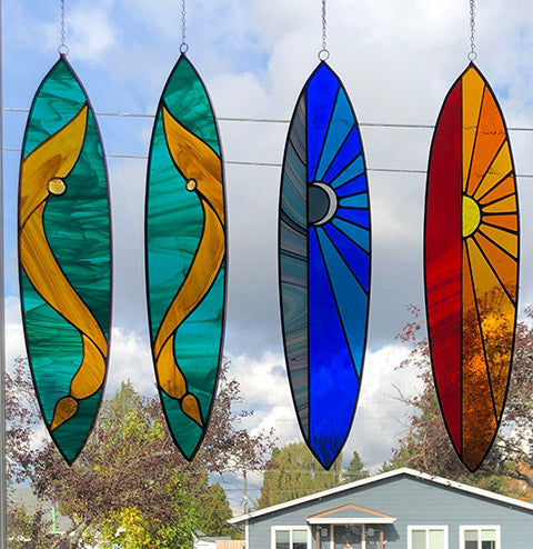 These mini glass boards are inspired by Ventana's finely crafted patterns on their surfboards. Sized to match exactly to the mini boards that Ventana creates for wall hangings, these can hang in any window, alone, or in a collection. Handcrafted from a combination of mouth blown and machine pressed glass.