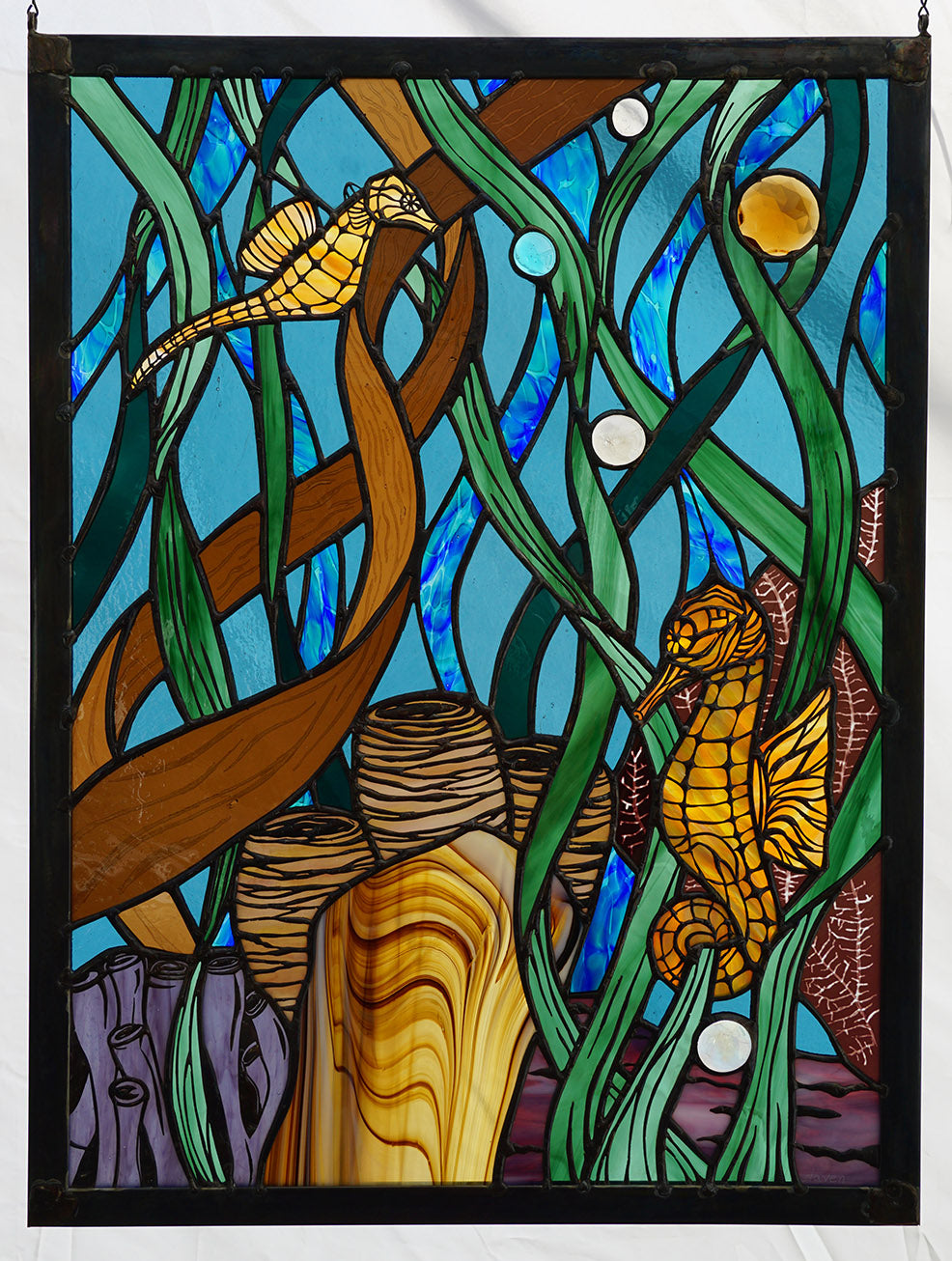 Horsing around is a playful stained glass scene with a lot going on. Hand engraved glass, copper foil overlay, round and faceted jewels and mouth blown glass bring this seaweed and coral setting to life. This is the ultimate underwater experience in glass!
