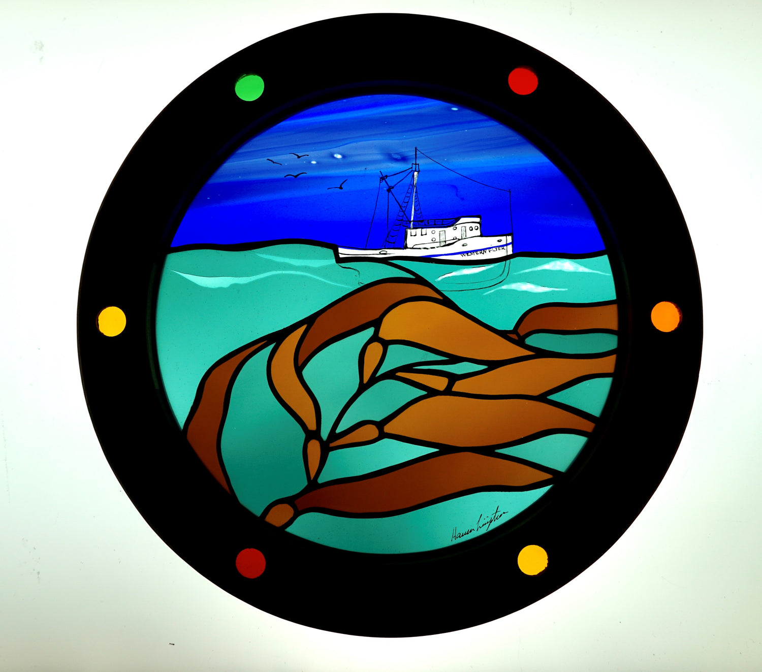 A collaboration between Ventana and Haven to celebrate the research vessel Western Flyer. The boat was originally built in Tacoma, WA before making its way to the Monterey Bay and becoming famous in John Steinbeck's The Log from the Sea of Cortez. Douglas fir from the hull of the original Western Flyer vessel was used by Ventana to build this porthole frame in Santa Cruz. Haven took these frames back to Tacoma, where she created this porthole view of the vessel cruising through waters of the Pacific. The glass used in this piece was mouth blown in Seattle, WA. Haven used techniques of sandblasting, and kiln fired paints to add details to the glass. The red and green glass in the top two screw holes for the frame represent the guiding lights ships would see when returning to port, "red, right, return" and the green light to the port side, signifying always being able to find your way home.